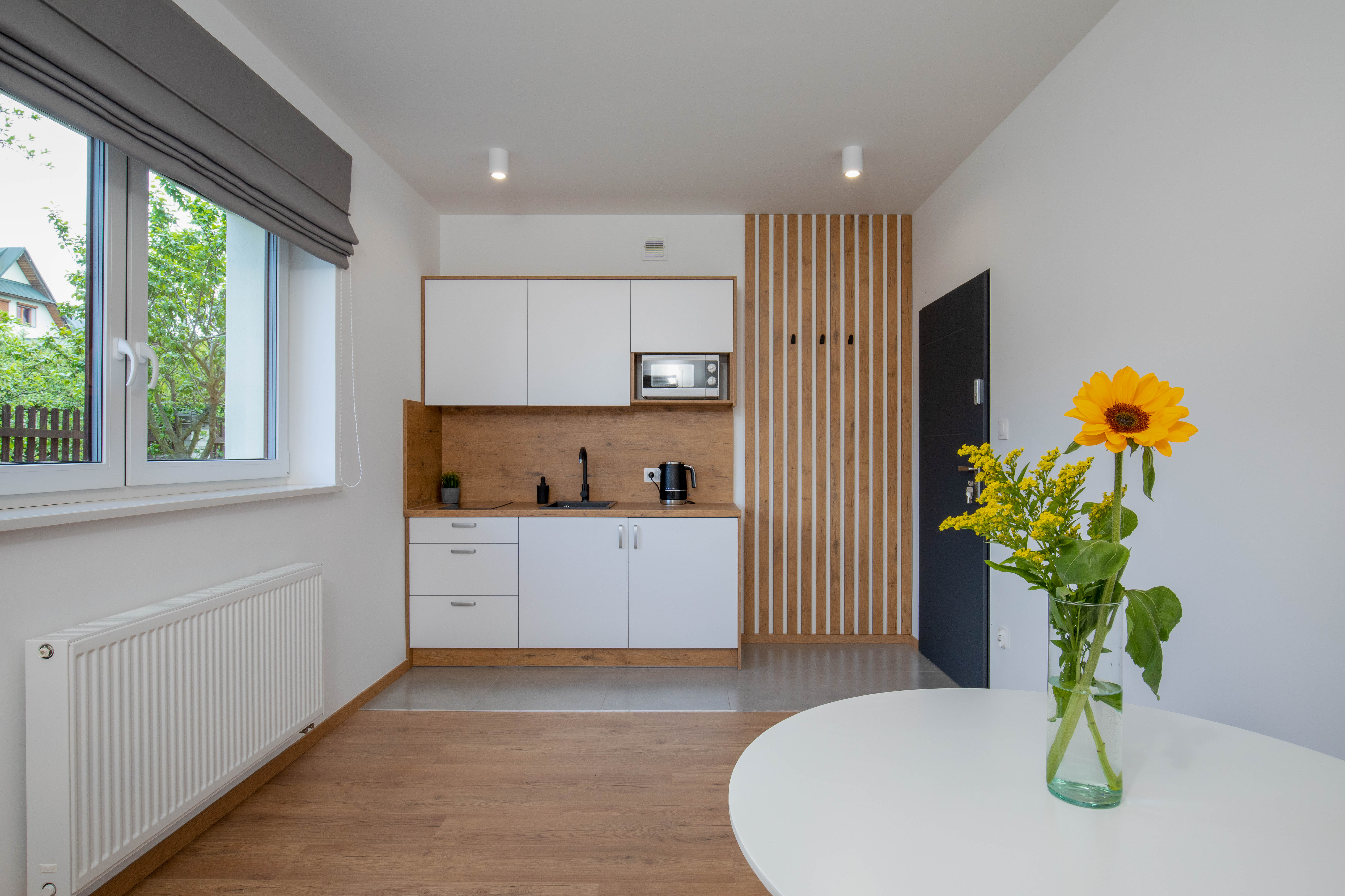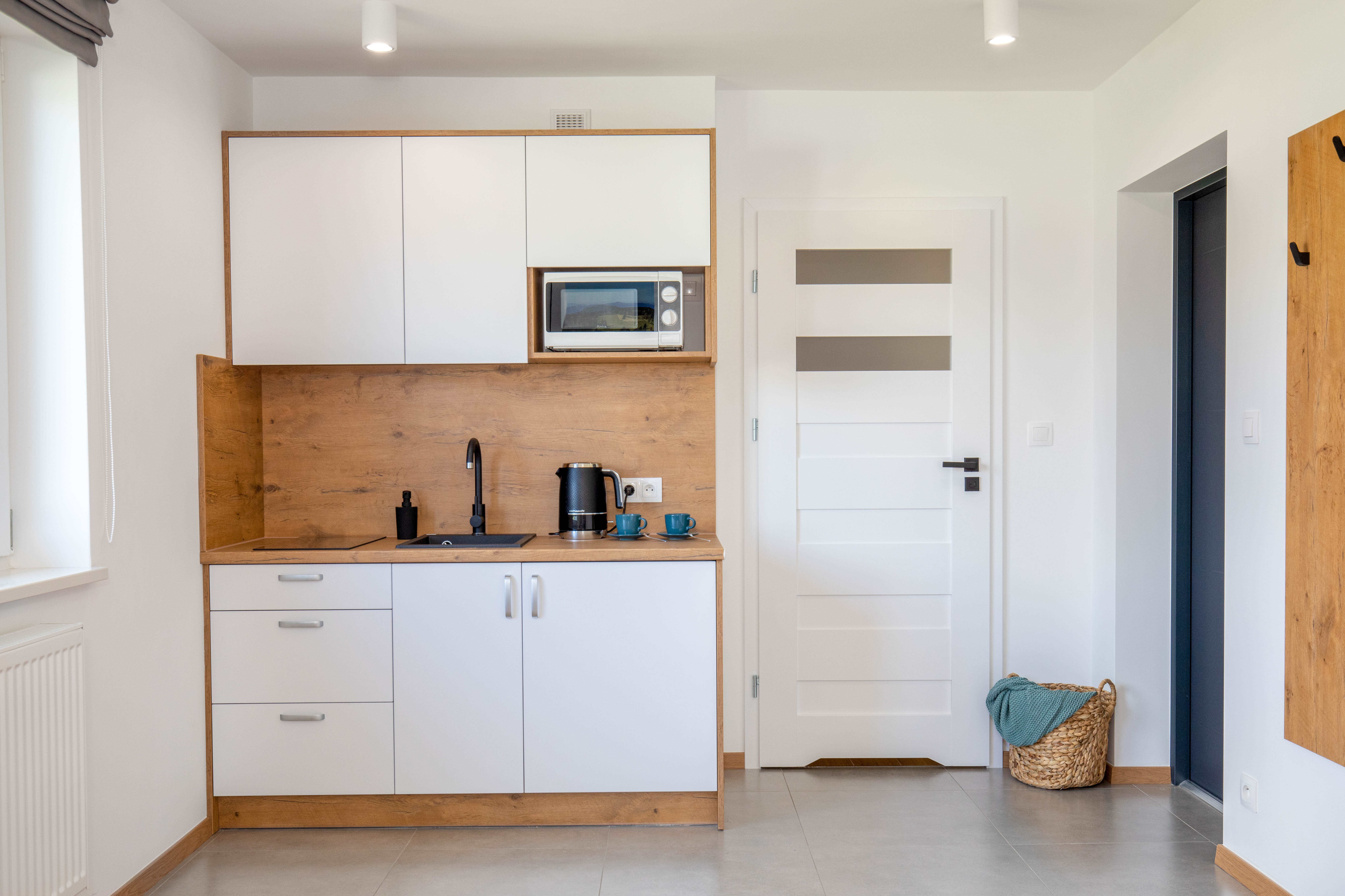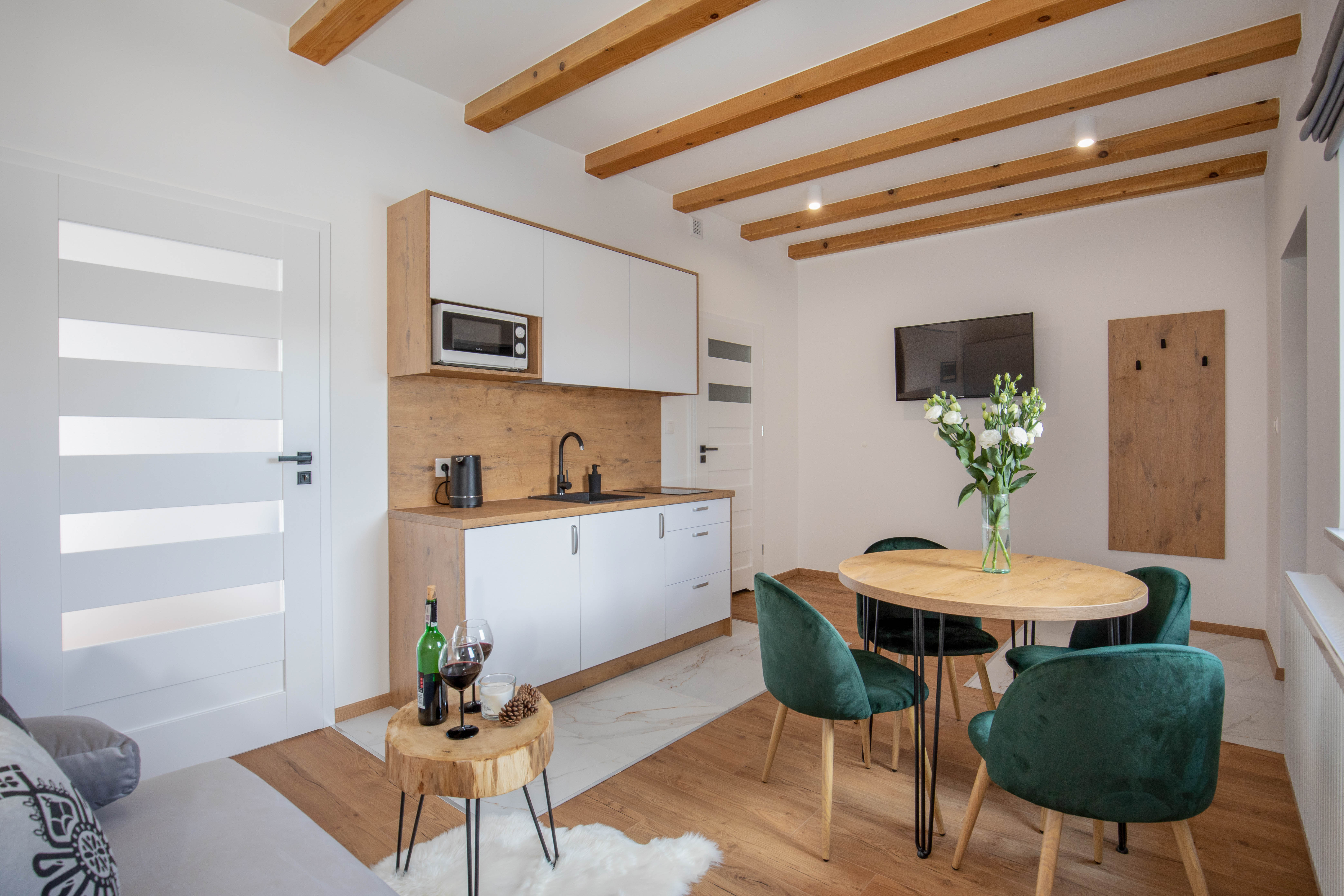 W każdym z pokoi znajduje się TV, internet, w pełni wyposażona kuchnia (zestaw naczyń, garnki, sztućce, lodówka, blat ceramiczny, mikrofalówka, zlewozmywak), jedna łazienka z zestawem ręczników i kosmetyków, przeszkloną kabiną prysznicową, deszczownicą oraz drabinką podgrzewaną na ubrania. Goście mają do dyspozycji leżaki, koce i pościel z bielizną pościelową.